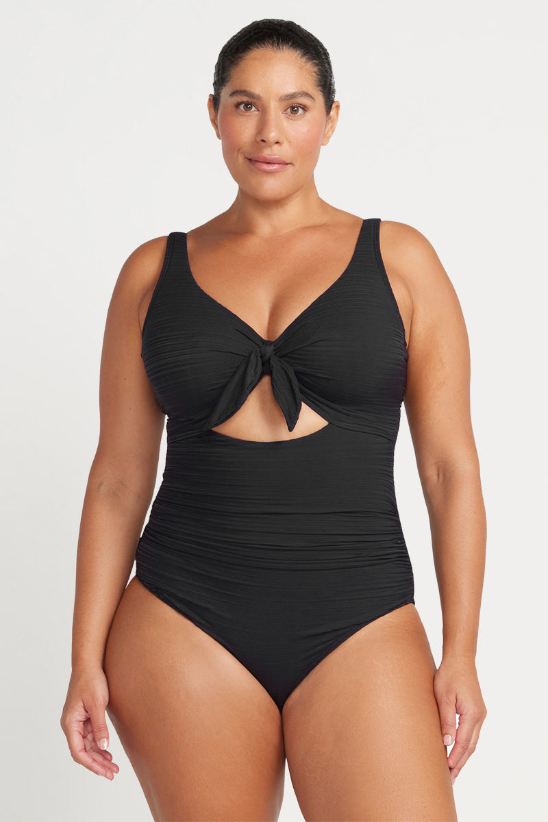 Our Botticelli One Piece is designed to sculpt your curves, offering wire free comfort and support. This style has a loop front twist detail with multifit cup support that fits a C - DD cup. Botticelli has good bottom coverage with full body 360 degree powermesh and front body ruching for body sculpting confidence.