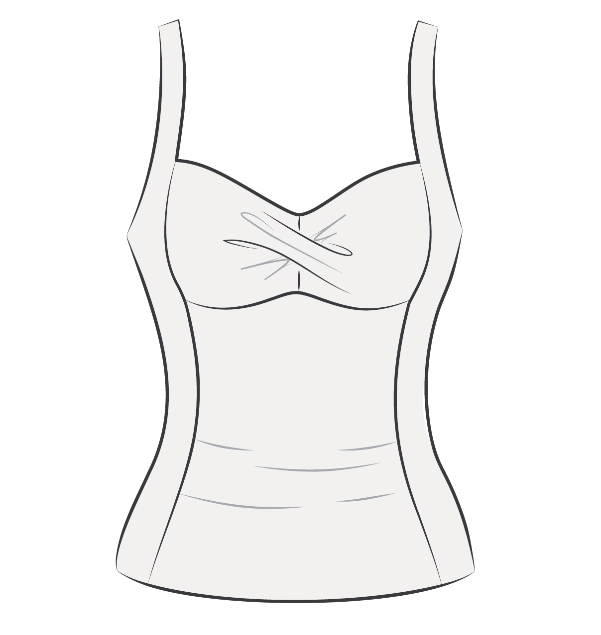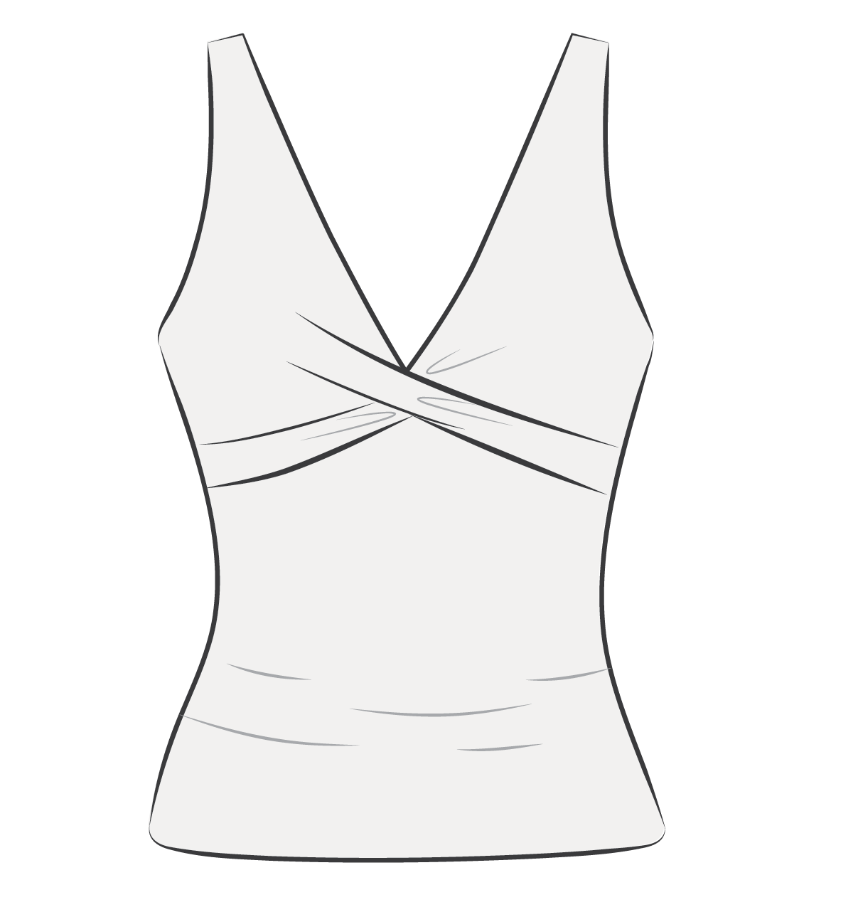Our Delacroix tankini top is a wire free style offering comfort and support for a range of bust sizes. Delacroix has a cross front design with multifit cup support that fits a D-G cup. Delacroix has full body 360 degree powermesh and front body ruching for body sculpting confidence. This tankini is a perfect full coverage look when you need a different sized top and bottom.