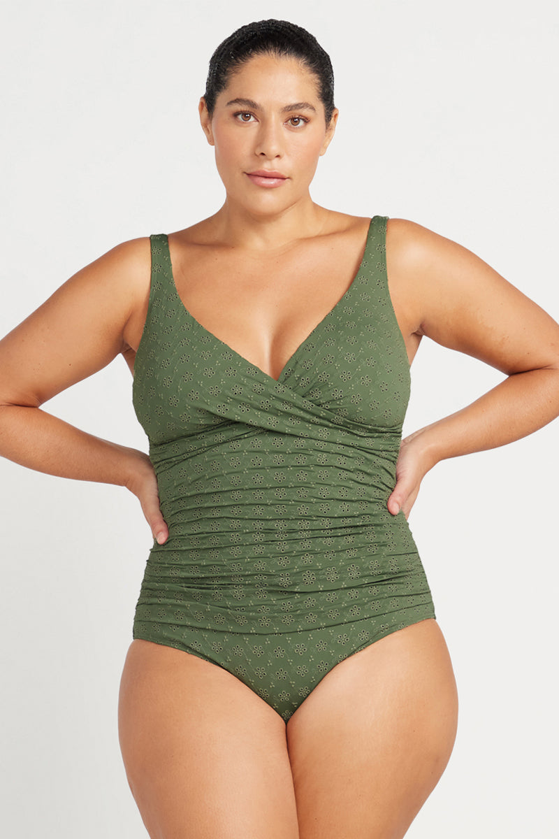 Cross over ruched front - The front of this curvy swimsuit is a cross over design that flatters the shape of your bust and adds extra wirefree support.