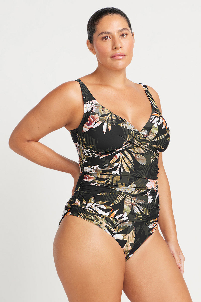 Cross over ruched front - The front of this curvy swimsuit is a cross over design that flatters the shape of your bust and adds extra wirefree support.