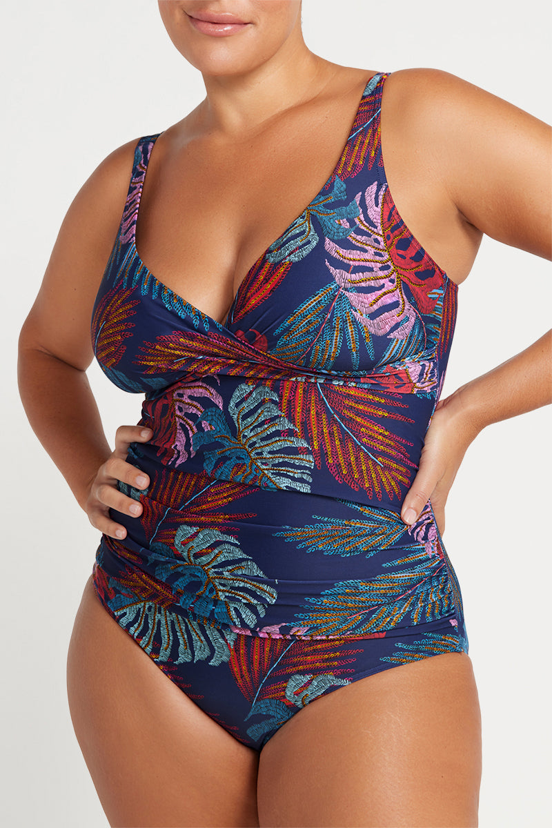 Cross over ruched front - The front of this curvy swimsuit is a cross over design that flatters the shape of your bust and adds extra wirefree support.