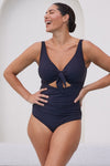 Artesands fits your curves. Make a curve statement in our Artesands Cezanne plus size one piece, the most flattering swimsuit shape EVER. Our Cezanne one piece has a mock knot tie at the front that covers a full internal cup support system. Our Cezanne shape is an underwire style with full foam cups that create great bust shape for a D cup, DD cup and E cup. But it is the peep hole on this style that creates the most amazing figure flattering illusion. The peephole creates a body enhancing hourglass shape and when paired back with our full body 360 degree powermesh and our front panel ruching this style is truly flattering. Cezanne has good moderate bottom coverage.