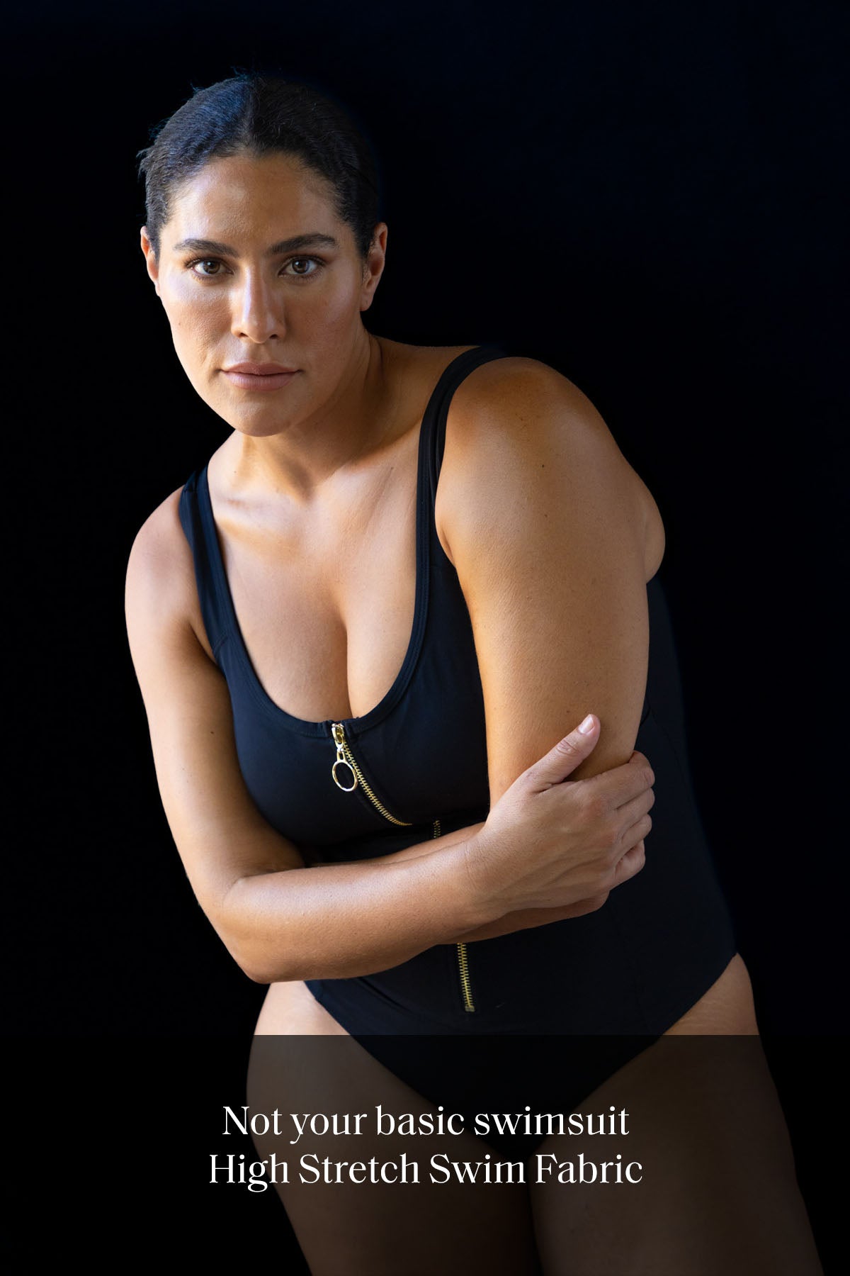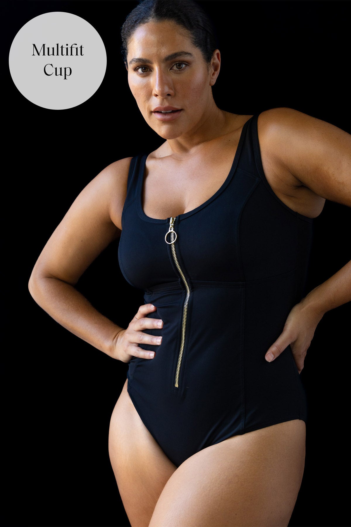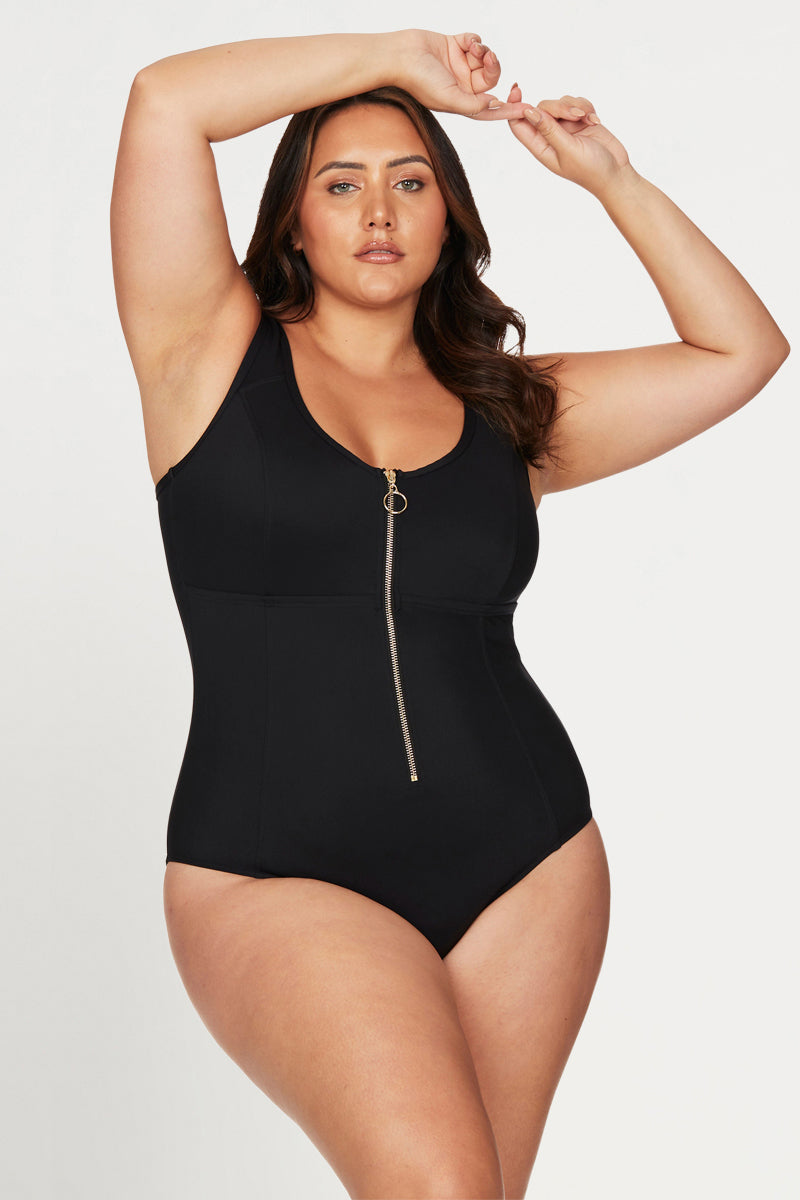 Gold Zip Front Feature - Our Fuseli swimsuit has a zipper front feature with a lockable zip. This zip has an internal zipper placket for skin protection.