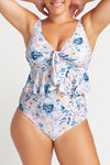 Knot tie front - This curve fit swimsuit has a knot tie front that can be adjusted to your preference.