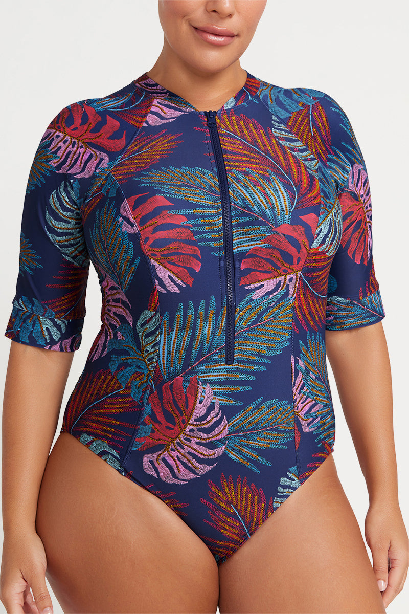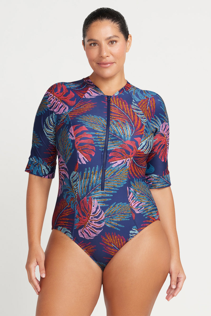 Artesands fits your curves. Be free to enjoy the summer in our curve fit and plus size sun safe Seurat sun suit. This one piece sun safe swimsuit features internal soft moulded multifit cups with a built in front shelf bra. With adjustable full zipper closure in the front and mid sleeve length. The length of the sleeve falls just above the elbow this allows for ease of arm movement but with the most amount sun protection. Our sunsuit has been designed with internal front powermesh for body sculpting confidence and good moderate bottom coverage. UPF 50+ to embrace the summer with maximum protection.