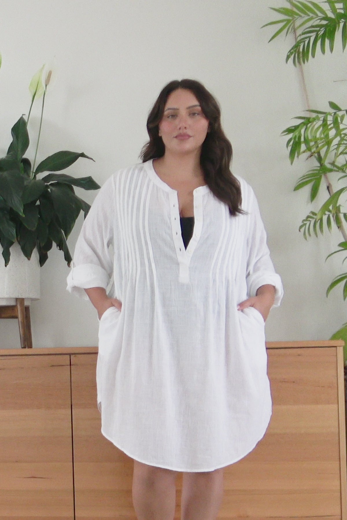 Artesands Fits Your Curves. Gershwin is our curve fit throw on, over shirt kaftan. This cover up has pin tucked detail and a button placket from the waist up. Gershwin has been designed with long sleeves that can be rolled up to a 3/4. Artesands specially designed resort wear made to wear over your curve fit swimsuit. Gershwin is made with 100% soft wash, lightweight, breathable cotton fabrication.